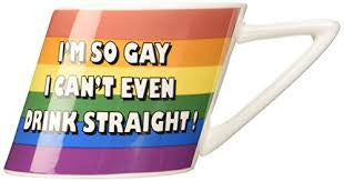 Tilted mug with rainbow background, that reads "I'm So Gay I Can't Even Drink Straight" in white block letters.