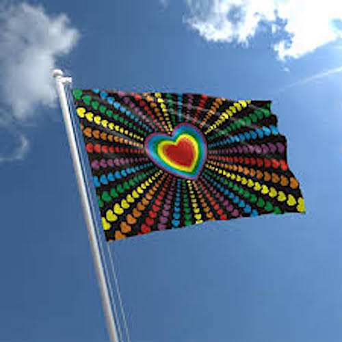 Silkscreened flag adorned with rainbow hearts! Show your love and pride! 2 x 3 feet.