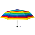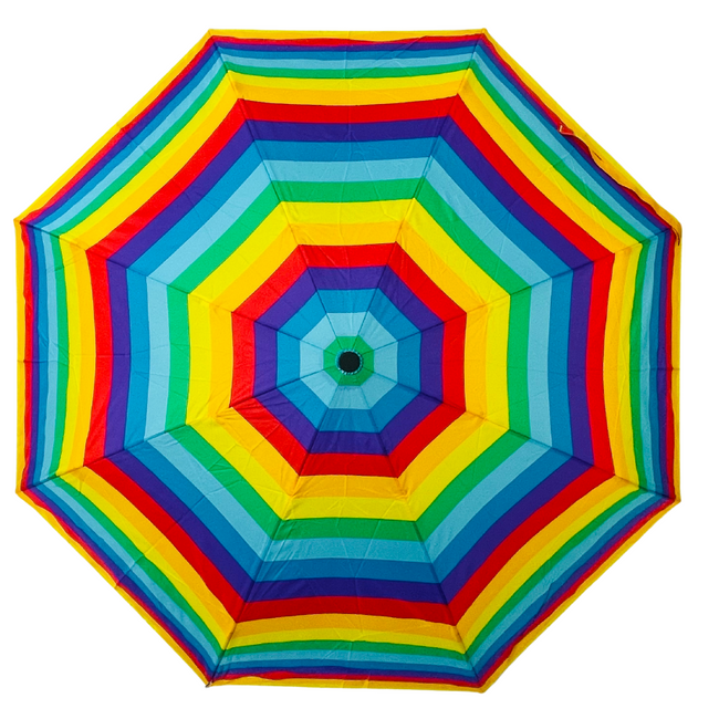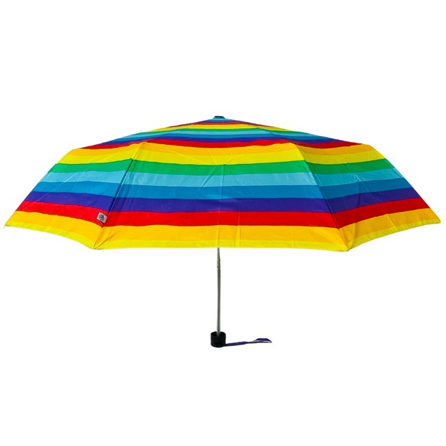This small rainbow umbrella opens manually and folds into three parts. It is windproof and comes with a Velcro tie band, matching sleeve, and a removable handle strap. The fabric is pongee, with aluminum poles and ribs made of aluminum and fiberglass. The handle has a rubber-coated plastic grip. It measures 42 cm in diameter, folds down to 9 inches, and has 8 ribs, each 21 cm long.