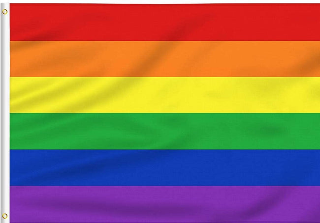 Silkscreened rainbow pride flag with grommets on one side. Show your pride! 4 x 6 feet.