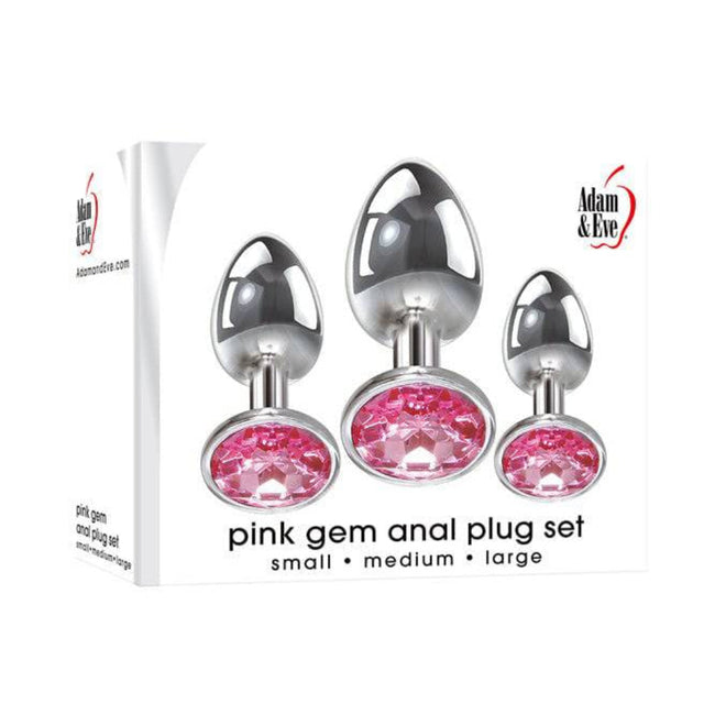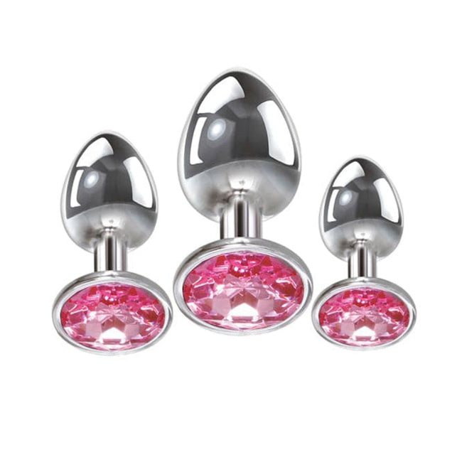 Choose from 3 sizes - train your way to undeniably hot backdoor pleasure - one step at a time. Start with the small plug, add plenty of lube, and experience the tantalizing feel of this special erogenous zone. Once it's all the way in, flash your partner with a pink jewel - for a flirty look! Use the medium & large sizes to work your way up to the most intensely pleasurable anal stimulation you've ever experienced. The smooth metal surface glides in easily, and the flared safety base provides effortless navigation.