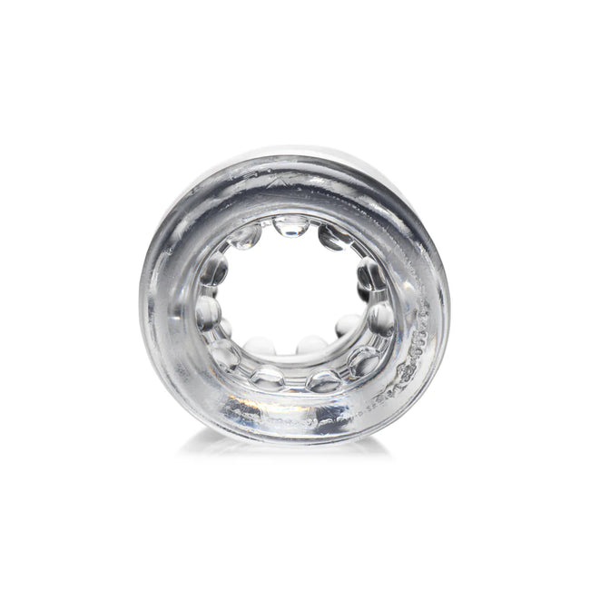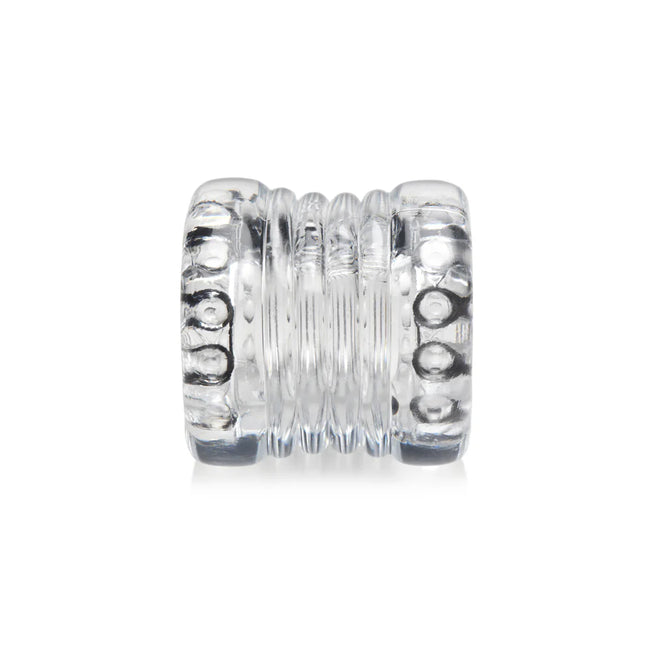 Enhance your pleasure and extend the duration of your play when stretching your balls! This stacked ball stretcher is made out of body-safe, phthalate-free, stretchy TPE and fits over the balls and firmly holds them away from your shaft. The stacked layers give you just enough stretch and pull without any forcefulness or pain. They have a good amount of give to them so they'll remain comfortable while being worn for a long duration and moving around from position to position. At both ends of the tunnel are rows of textured nubs that add extra stimulation and grip. Use only with water-based lubricants for best results and avoid petroleum products. To clean, use warm water and mild soap, then rinse it off and spray it with a toy cleaner before letting it air dry.