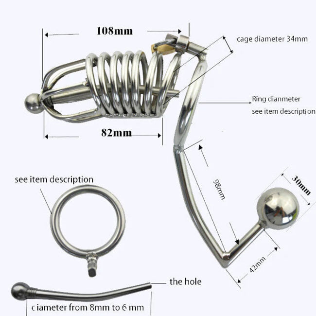 Includes lock and key. Optional urethral insert available. With this ultra-complete chastity cage comprising a cage, a metal ball as an anal plug, and urethral insertion.