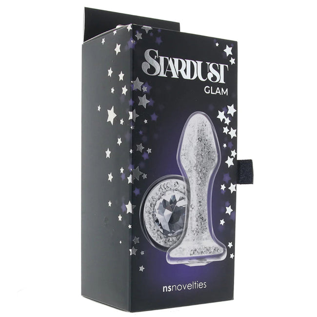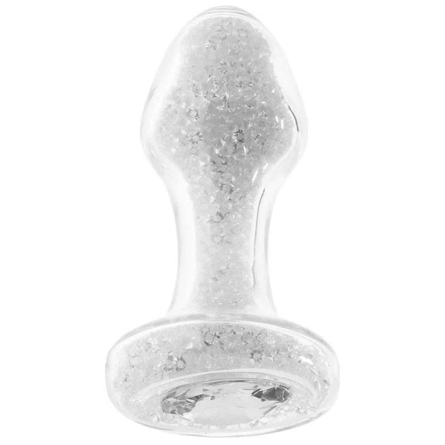 Total length: 3.75 inches. Insertable length: 3 inches. Widest girth: 4.4 inches. Width: 1.4 inches. Material: borosilicate glass with iridescent glitter beads and crystal gem.