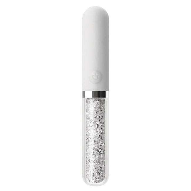 Luxurious white bullet vibrator featuring a crystal-filled borosilicate glass body that combines aesthetic beauty with sensual function. The sophisticated design makes it as visually stunning as it is pleasurable.