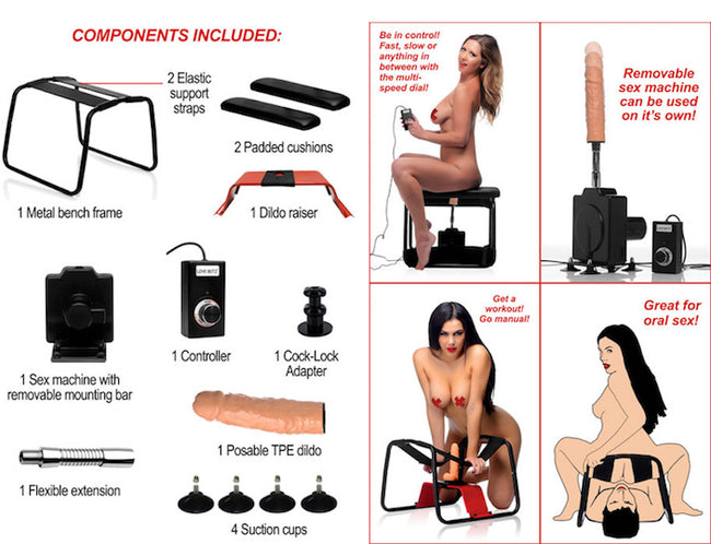 Attach your favorite dildo and this sex stool will give you the ride of your life. The Bangin Bench allows you to simulate sex from the top as you bounce up and down, aided by the stretchy straps of the seat. Use it on your own for penetrating intensity that is easy to control, or put on a show for your partner. You can even remove the red raiser bar and use it to straddle your lovers face while they pleasure you from below.