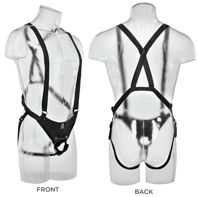 • Included in this set is a sturdy, durable harness that hugs your body (up to 52" waist) that features completely adjustable suspenders and thigh straps with buckles that won't come loose during the fun.