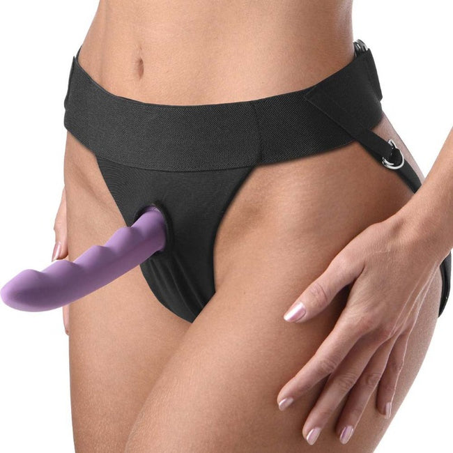 Couture and comfort collide with this uniquely designed harness system. Featuring X-style fabric panels, to help secure the dildo and keep it from chafing against the skin, making it ideal for extended wear. This exceptional design allows you to easily switch toys during play. Avalon is outfitted with highly adjustable slide-through buckle straps that will adjust to fit up to a 46 in. waist.