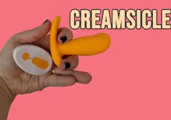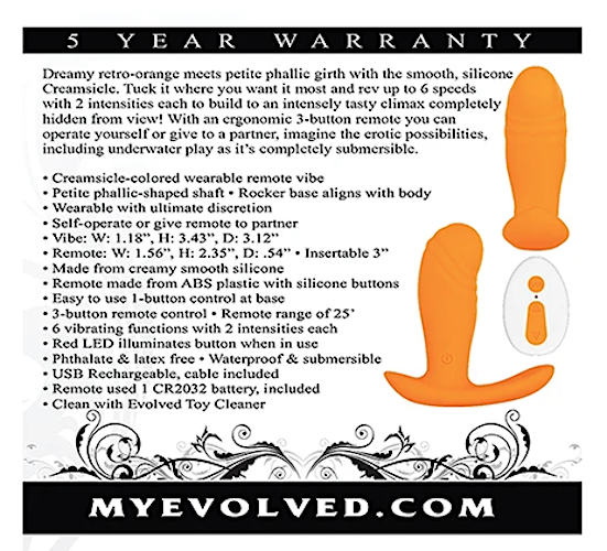 Evolved Creamsicle Vibrating Probe from Evolved Novelties. Dreamy retro orange meets petite phallic girth with the smooth, silicone Creamsicle. Tuck it where you want it most and rev up to 6 speeds with 2 intensities each to build to an intensely tasty climax completely hidden from view!