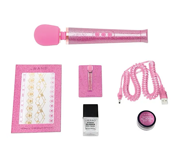 In addition to a powerful, rechargeable wand massager, the All That Glimmers Special Edition Le Wand Petite set comes with a Guide to Wand Use, a Coiled Glimmer Charging Cord, a Glitter Travel Case, a Le Wand Enamel Pin, Rainbow Glimmer Nail Polish and Body Gel, as well as Metallic Temporary Tattoos.