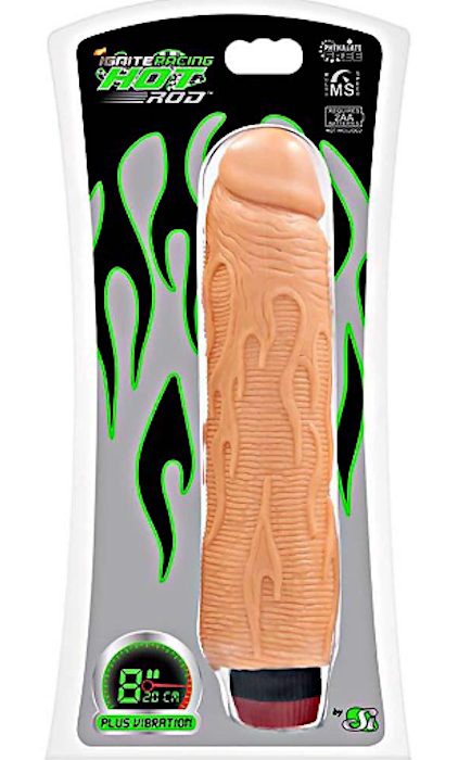 The Ignite Hot Rod Vibrating Dildo measures 2 inches across at its widest point and 11.25 inches long, with up to 10.25 inches insertable. The sex toy is made from heavy-duty PVC. The weighty vibrating dildo is firm for easy insertion while remaining flexible enough to easily bend and twist to hug your body’s natural curves. The vibrator is powered by 2 AA batteries, sold separately. The base twists off so you can access the battery compartment.