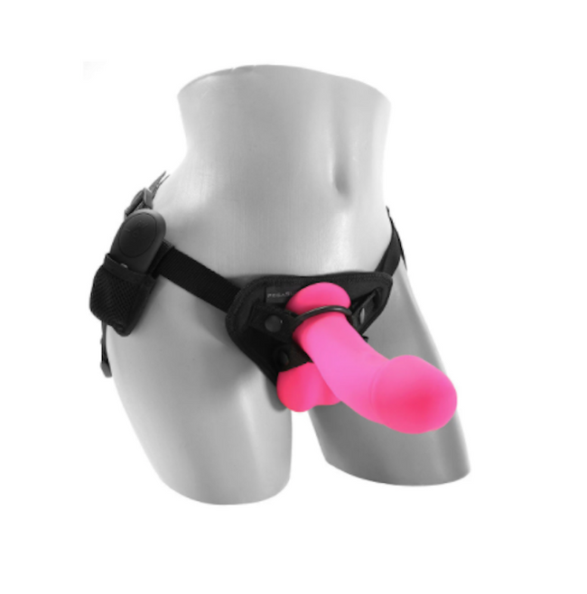 The Realistic 6.5" Ballsy" vibe (or just about any other favourite penetrator) slides into place through the O-ring - which un-snaps for a quick, easy set-up. In soft, supple silicone with plenty of firmness underneath, the included vibe targets your or your partner's inner erogenous zones with no trouble at all. Use a button on the base of the 6.5" to start up vibration, or use the included long-range (30'/10m) remote. Speaking of the remote, it slips handily into an optional pouch that can be attached to the waistband of the harness.
