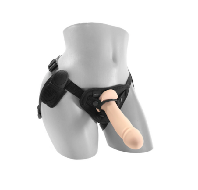 The Realistic 6.5" vibe (or just about any other favourite penetrator) slides into place through the O-ring - which un-snaps for a quick, easy set-up. In soft, supple silicone with plenty of firmness underneath, the included vibe targets your or your partner's inner erogenous zones with no trouble at all. Use a button on the base of the 6.5" to start up vibration, or use the included long-range (30'/10m) remote. Speaking of the remote, it slips handily into an optional pouch that can be attached to the waistband of the harness.