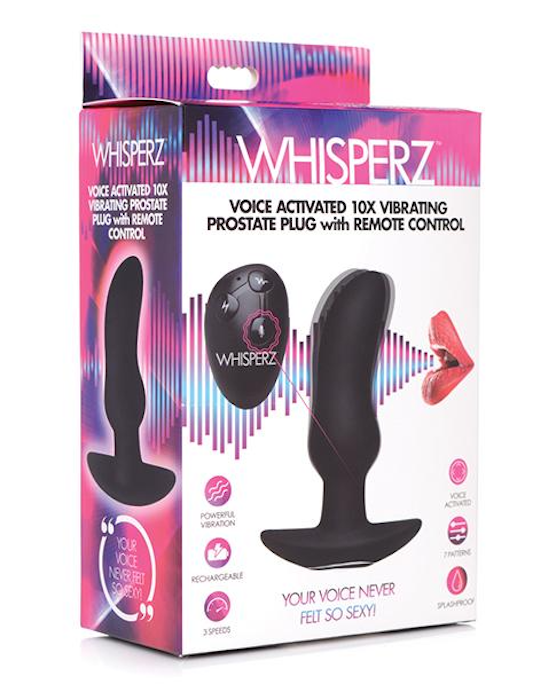 Voice Activated 10X Vibrating Prostate Plug w RC Your voice never felt so sexy! This exciting Whisperz prostate plug is designed for unpredictable remote partner play with its cutting edge voice activated technology. The included wireless controller lets you or your lover please your prostate with little more than a whisper from up to 25 feet away!