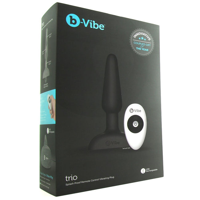 Boasting three intensely powerful motors, a seriously satisfying unisex shape in velvety silicone and nine speed-variable modes of tireless vibration, b-Vibe's Trio Plug packs tons of unique remote functionality and guaranteed pleasure into a versatile black taper.