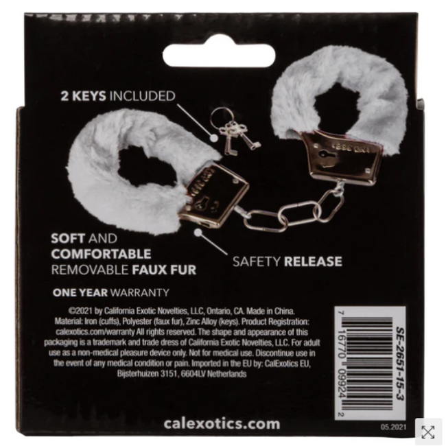 Wrap around your back or around bedposts to relinquish total control to your lover and heightened pleasure while the plush faux fur keeps your wrists comfortable. The commanding cuffs are complete with 2 lock keys and a safety release latch in case of an unexpected interruption.