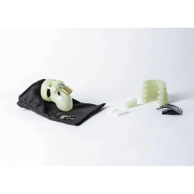 Made from high-quality and durable materials, the Mr. Stubb cock cage kit is a premium modular chastity cage system designed for a custom-tailored fit. The all-inclusive Glow-in-the-Dark CB-chastity kit includes U-rings, locking pins, spacers, and locks to create the ultimate chastity experience for beginners or well-seasoned chastity wearers.