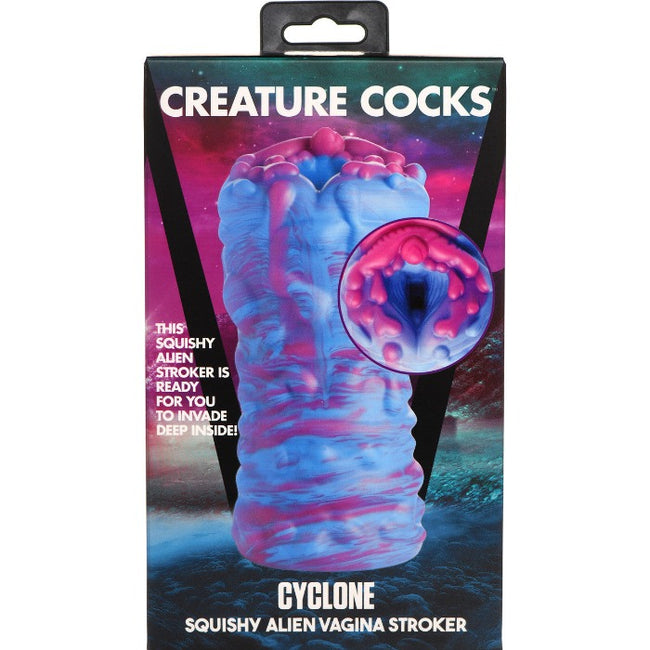 Cyclone - Squishy Silicone Alien Vagina by Creature Cocks: This extraterrestrial, squishy Cyclone Alien Stroker is out of this world! The thick, flexible, premium silicone is phthalate-free and silky smooth. Push yourself inside and penetrate the textured tunnel of this erotic alien orifice! Enjoy the vibrant color and gushy, wet look as you grip it and stroke away! Use only with water-based lubricants. To clean, use warm water and mild soap, then spray with a toy cleaner and let dry.