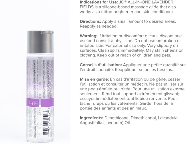 System JO Lavender Fields All-in-One Massage Glide is a silicone-based massage glide that also works as a tattoo brightener and skin conditioner. Formulated using only the highest quality silicone, this product collection provides an amazing touch sensation.