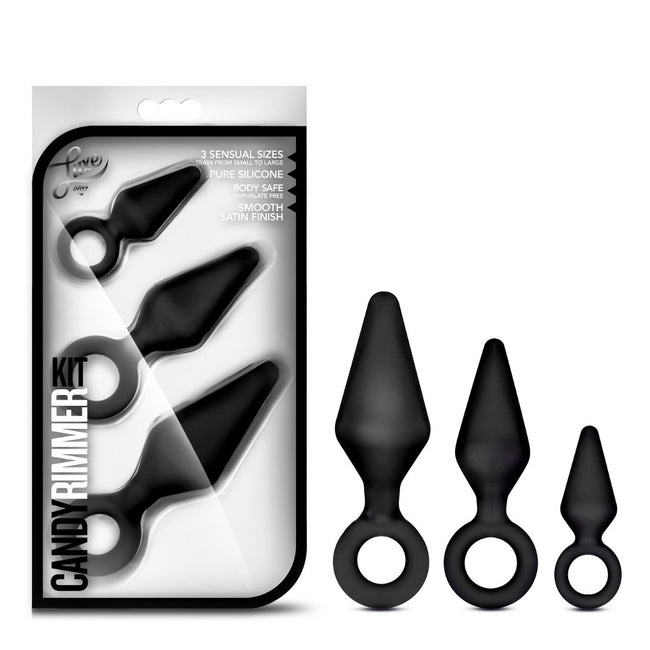 The Candy Rimmer Kit gives you all the satisfaction of anal training while being safe and gentle. These three plugs are tapered for comfort with thin necks to stay securely in place. Pure silicone with a smooth satin finish, they are body safe, phthalate free, and you can even boil them. The ring bases make removal a breeze.