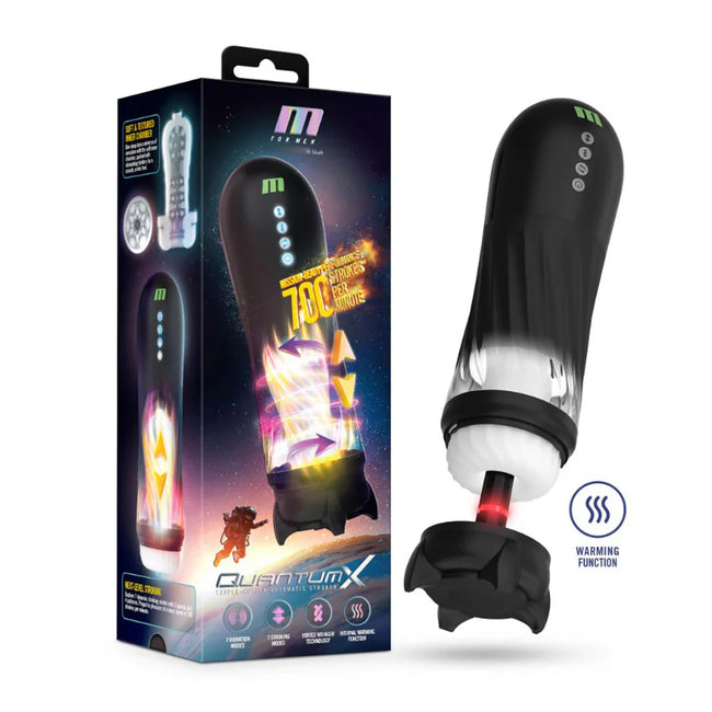 7 Powerful Vibration Modes (3 Speeds & 4 Patterns) 7 Dynamic Stroking Modes (3 Speeds & 4 Patterns) Vortex 'Wringer' Technology Delivers Mind-Blowing Pleasure Internal Warming Enhances Comfort & Pleasure Sensations Soft & Textured Inner Chamber and USB Rechargeable Compatible With Tester Display(s): Product Description Prepare to launch into pleasure with Quantum X. This cutting-edge, 3-in-1 automatic stroker from M For Men is engineered for explorers of ultimate satisfaction, blending groundbreaking innovation with sleek, high-performance design.