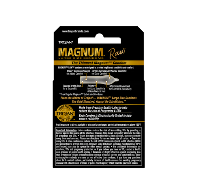 Now you can live large and thin. New from Trojan™, our Magnum™ Raw™ large size condoms are the thinnest Magnum™ condoms on the shelf. These condoms feature a wider contoured shape for a better fit and silky-smooth lubricant for maximum sensitivity. And with the extra comfort of a larger size, you’ll find an experience that lets you feel it all—big time.