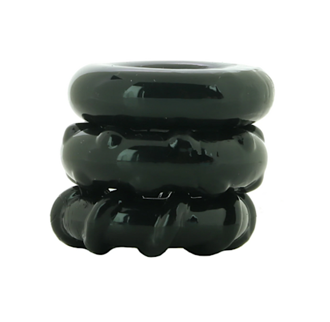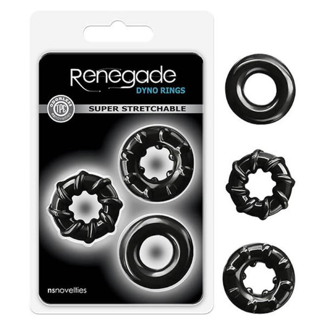 Renegade Rings are Performance Driven, Odorless TPE Rings that are Super Stretchy, Never Sticky and Available in Assorted Colors, Shapes and Sizes. Try them all for a variety of sensational possibilities and incredible results. Suitable for all lubricants. Creatively textured for maximum pleasure and designed to perform as hard as you play, Renegade's three Dyno Rings offer up tons of playtime enhancement potential. Stack 'em or wear solo - the hard results won't let you down!