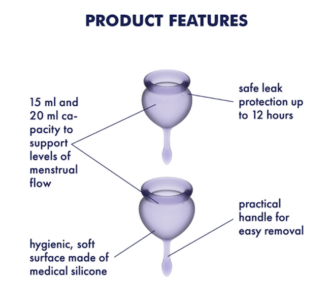 You’re always on the safe side with the Satisfyer Feel Good Menstrual Cups. The set of 2 cups, each with 15 ml and 20 ml capacity, is suitable for light to heavy flows and offers a lot of advantages over other menstrual hygiene products. The cups are made of medical-grade silicone, which is particularly hygienic and adapts to your body’s contours. That means the cups are not only especially comfortable, but also offer secure protection from leaks for up to 12 hours: Swimming, sports or outings - you can do anything with the Feel Good Menstrual Cups from Satisfyer!